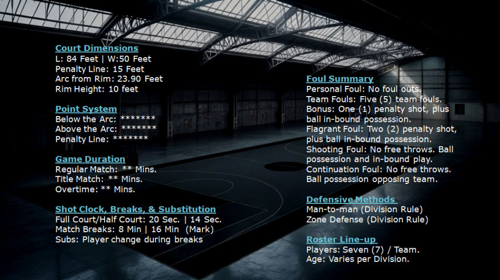 The rules governing the M1 Open games are based on the standard regulations used in professional (NBA & FIBA) and amateur (NCAA) basketball. However, select modifications have been introduced to better reflect the true essence of the sport—intense, competitive play. The revised rules are outlined below.